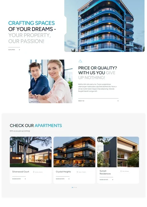 A WordPress‑based real estate platform featuring advanced property listings, smart filters, dynamic search, and a custom agent dashboard.